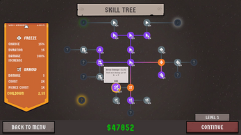 I feel like there are some potential balance issues, depending on how difficult you want the game to be and the total length. You can beat the demo if you max out all the tree (only one I didn't max out yet was tower health), which then poses an issue for the following levels if enemy strength keeps going up without enough damage output to match. I have a few suggestions (take these with a grain of salt if it doesn't match the difficulty you're shooting for):