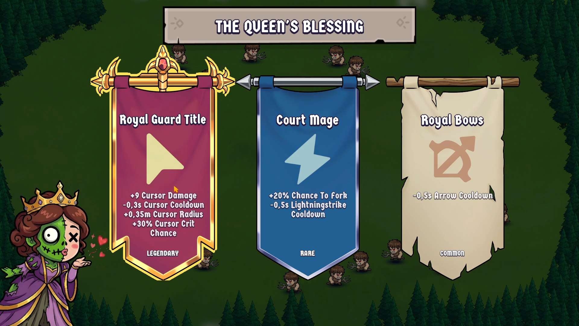 3) Queens blessing is almost too OP, it's the only one that matters. Because bow and lightning are the only 2 effective attacks, as long as you get a good arrow buff you can win. Only problem is that when you lose it the next round you are then severely under powered until you get the good bow upgrade again. I like the random element the queens blessing provides, but the balance is off so instead of testing out different strategies for success you basically are just level grinding until you the right blessing. Hopefully in the full game there's enough level variety to warrant buffing each weapon type.